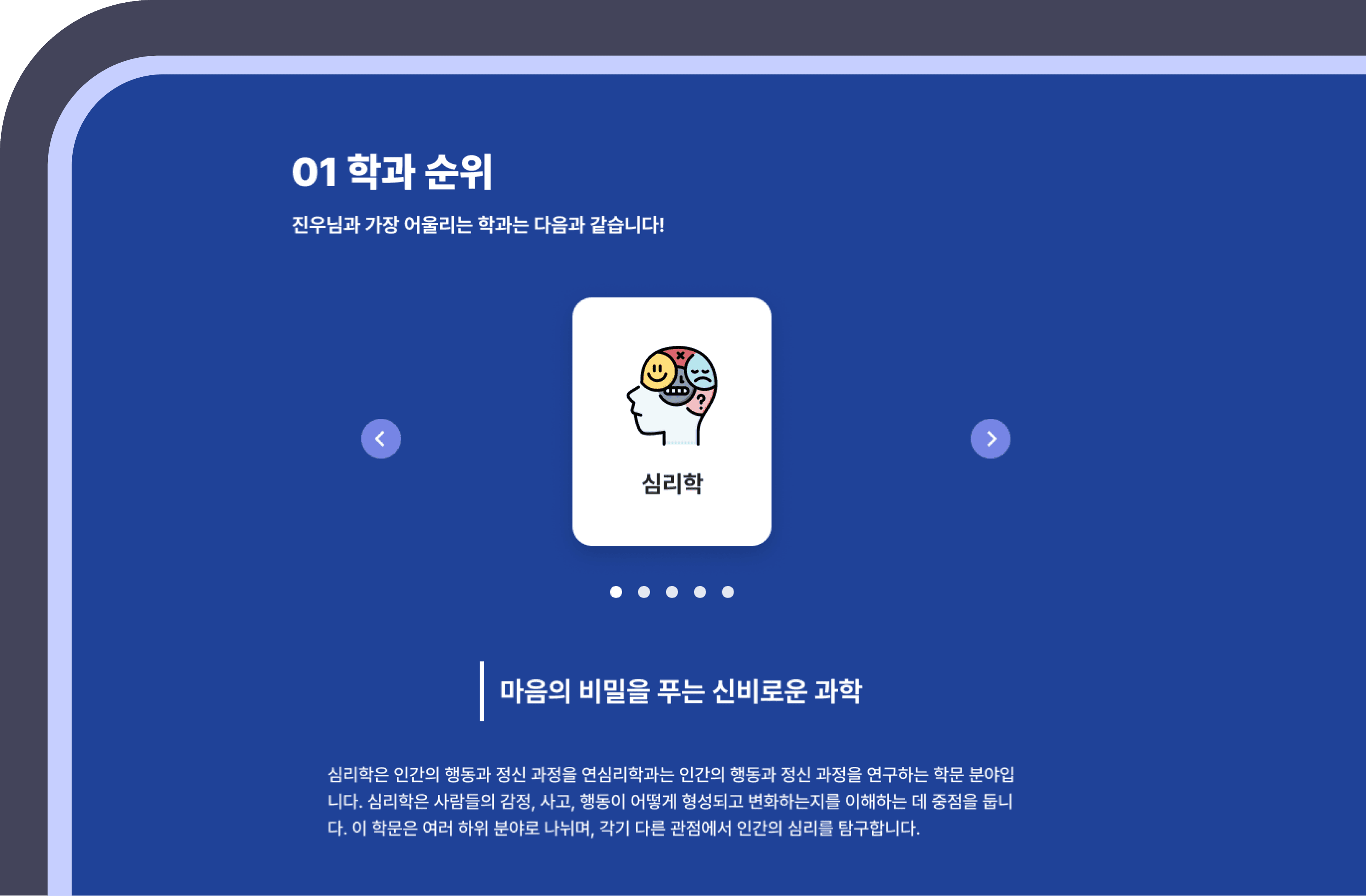 나의 응답을 바탕으로 내 적성에 가장 적합한 5가지 학과를 1-5 순위로 분석해 드려요. 함께 제공되는 학과 기본 정보 및 인재상, 심화분야, 커리큘럼 정보를 통해 나의 추천 학과에 대해 더욱 구체적으로 알아볼 수 있어요.