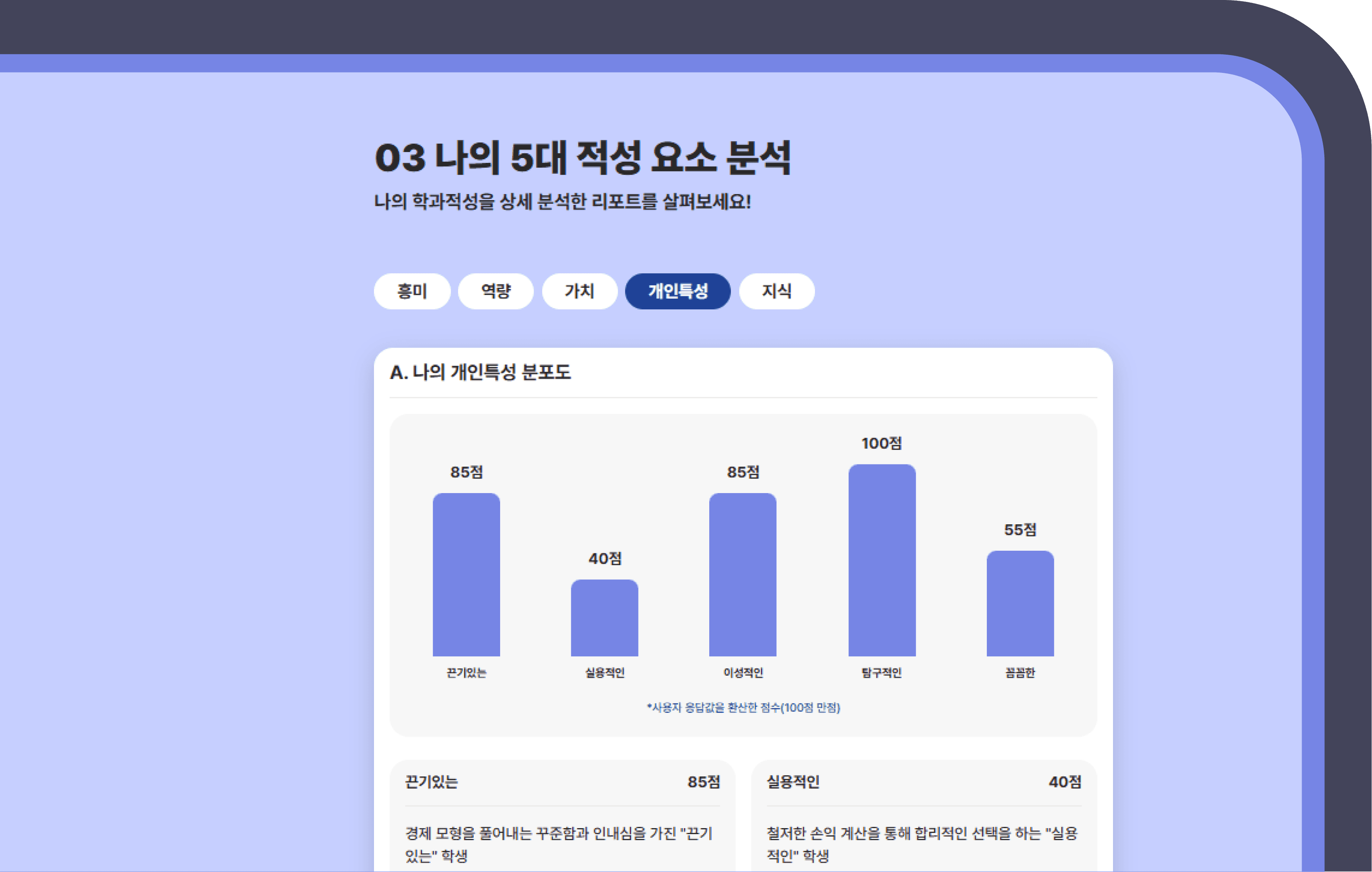 단순히 흥미만으로 추천하지 않아요. 내 적성에 딱 맞는 학과를 찾을 수 있도록 내 역량, 흥미, 지식, 가치, 개인특성을 파악해 강약점을 다각도로 분석해요.