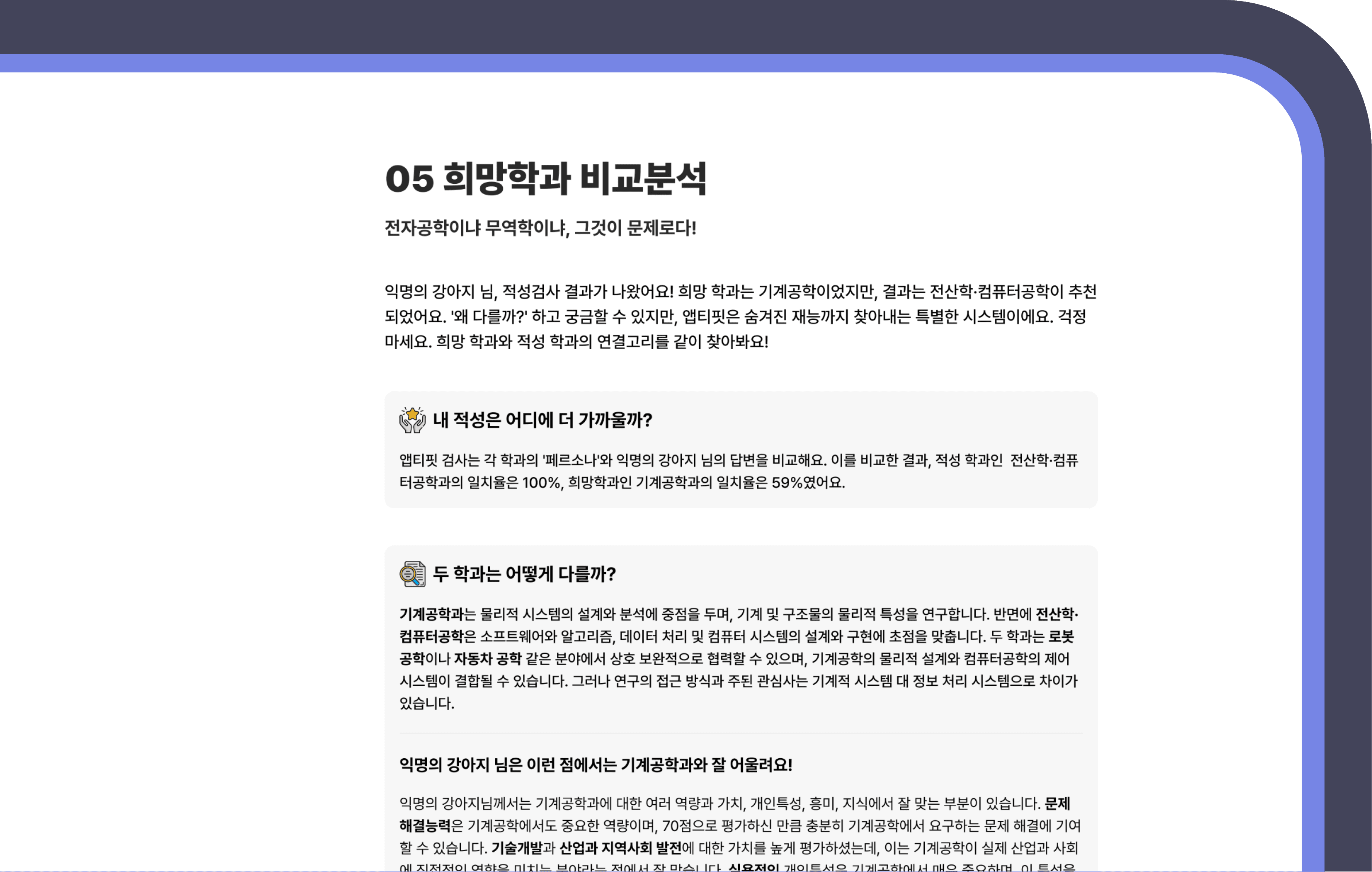 희망하는 학과를 놓치기 아쉽다면 앱티핏이 그에 맞춰 솔루션을 제시해드릴게요. 여러분이 희망하는 학과와 추천학과가 얼마나 차이나는지 알려드리고, 강약점을 찾아내 두 분야에서 융합형 인재로 거듭날 수 있는 연결고리를 찾아드릴게요!