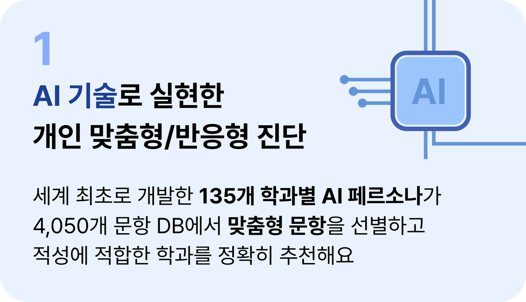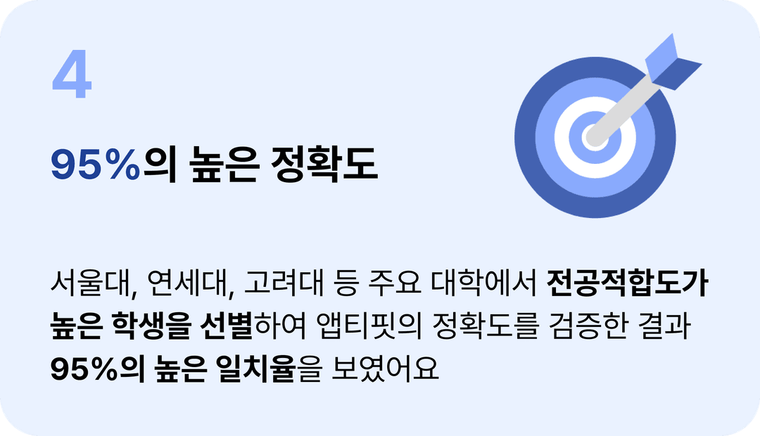 앱티핏은 인공지능을 활용해 전국 4년제 대학의 모든 학과(유사 및 중복 제외 시 139개 학과) 중 내 적성에 맞는 학과를 5대 적성 요소*에 근거하여 정확하게 찾아주는 개인 맞춤형 검사입니다