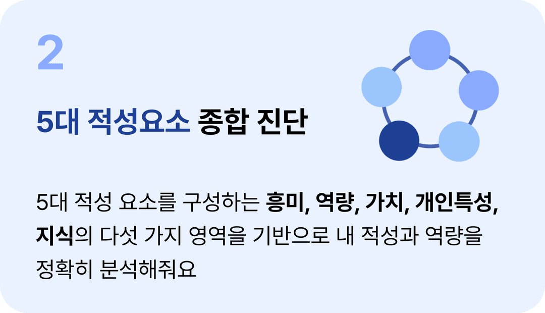 *5대 적성요소 : 흥미, 역량, 가치, 개인특성, 지식당신에게 딱 맞는 길을 찾아드려요!